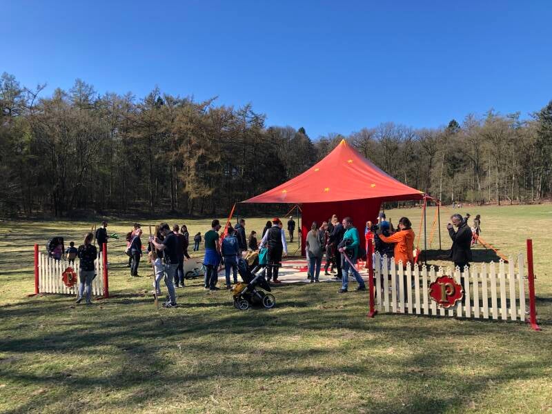 Wij zullen hier ons circusdecor opbouwen, en de gehele dag kunnen de kinderen hier, koordlopen, jongleren, diaboloen, hoela hoepen onder begeleiding van Yoshi en Clown Frasco.